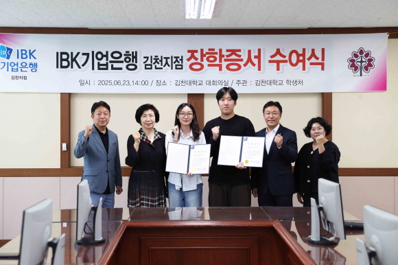 | 김천대학교(총장 윤옥현)에서는 6월 23일 김천대학교 대회의실에서 IBK기업은행 김천지점(지점장 정재원)이 지원하는 2025학년도 장학증서 수여식을 개최하고 장학금을 수여했다.