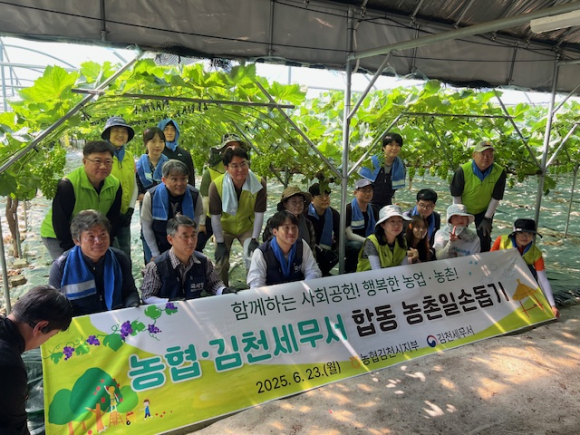 | 농협 김천시지부(지부장 여승묵)와 김천세무서(서장 김대중)는 지난 6월 23일 김천시 감천면 일원 포도 재배 농가에서 합동으로 농촌 일손돕기를 실시했다.