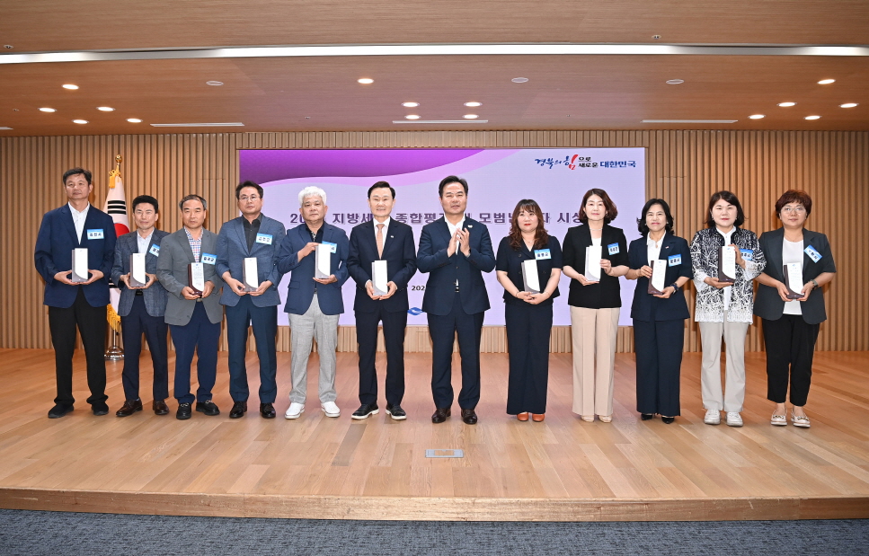 | 경상북도는 6월 25일 다목적홀에서 지방세를 성실히 납부하고 지역사회 공헌에 이바지한 공이 큰 14명의 모범납세자와 지방세정종합평가에서 우수한 성적을 거둔 11개 시군에 표창패를 수여했다.