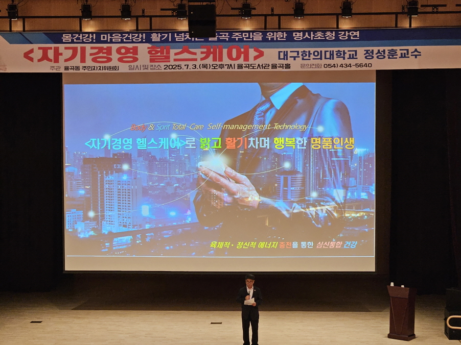 | 김천시 율곡동 주민자치위원회(위원장 어성천)은 7월 3일 율곡도서관 율곡홀에서 대구한의대학교 정성훈 교수를 초빙하여, 요즘 떠오르고 있는 ‘자기경영 헬스케어’를 주제로 무료 강연을 진행했다.