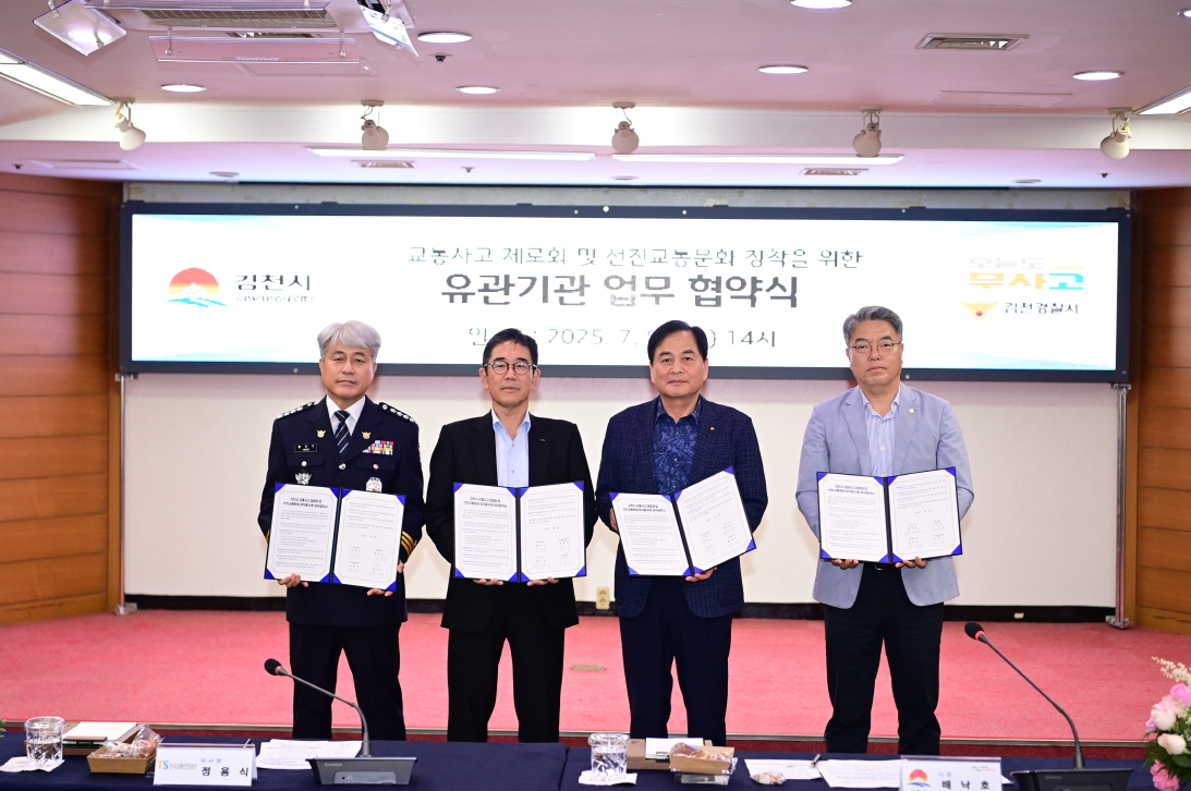 배낙호 김천시장은 “교통사고는 시민의 생명과 직결된 문제로, 이번 협약을 계기로 4개 기관이 힘을 모아 시민 모두가 안심하고 생활할 수 있는 교통 환경을 만들겠다.”라고 밝혔다.