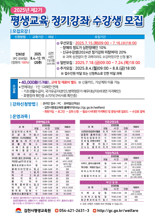 | 김천시 평생교육원은 7월 15일부터 8월 24일까지 「2025년 제2기 평생교육 정기강좌」 수강생을 모집한다고 밝혔다.
