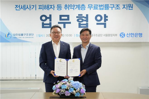 | 대한법률구조공단(이사장 김영진)은 7월 17일 신한은행(은행장 정상혁)과 함께 민생경제 악화로 법적·경제적 어려움이 가중되고 있는 기초생활수급자 및 전세사기 피해자 등 취약계층에 대한 지속적인 법률지원 강화를 위한 업무협약을 체결했다고 이날 밝혔다.