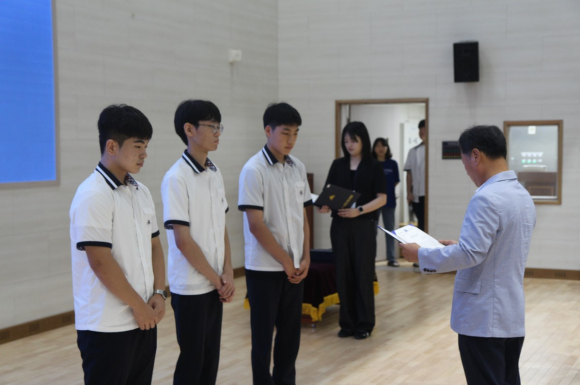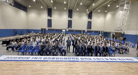 | 김천중앙고등학교(교장 김종현)는 7월 16일 본교 강당에서 ‘2025학년도 김천인재장학회 장학금 수여식 및 동문 명사 특강’을 개최했다. 이번 행사는 학생들의 학업 성취를 격려하고, 미래를 준비할 비전을 제시하기 위해 마련됐다. 이날 행사에는 최외출 영남대학교 총장(김천중앙고 10회 졸업생)을 비롯해, 김진국 총동창회 회장, 김무영 수석부회장, 김민재 사무총장, 최필수 이사, 이재모 장학이사(영남대학교 교수), 구영덕 홍보국장(동원과학기술대 교수), 이용권 상임이사, 이홍화 장학이사, 전성호 장학이사(새김천신문 대표), 강연진 감사, 백태현 장학이사, 김경훈 재무국장 등 동문과 장학회 관계자들이 참석해 자리를 빛냈다.