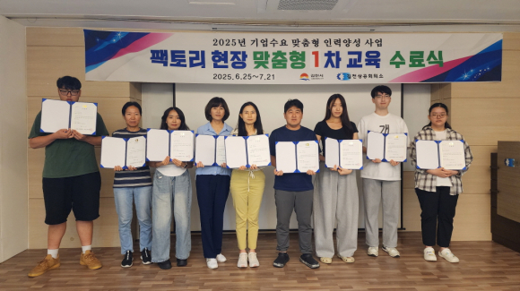 | 김천상공회의소(회장 안용우)는 ‘2025년 기업수요 맞춤형 인력양성사업’의 일환인 ‘팩토리 현장 맞춤형 교육 과정’의 1차 과정 수료식을 진행했다.