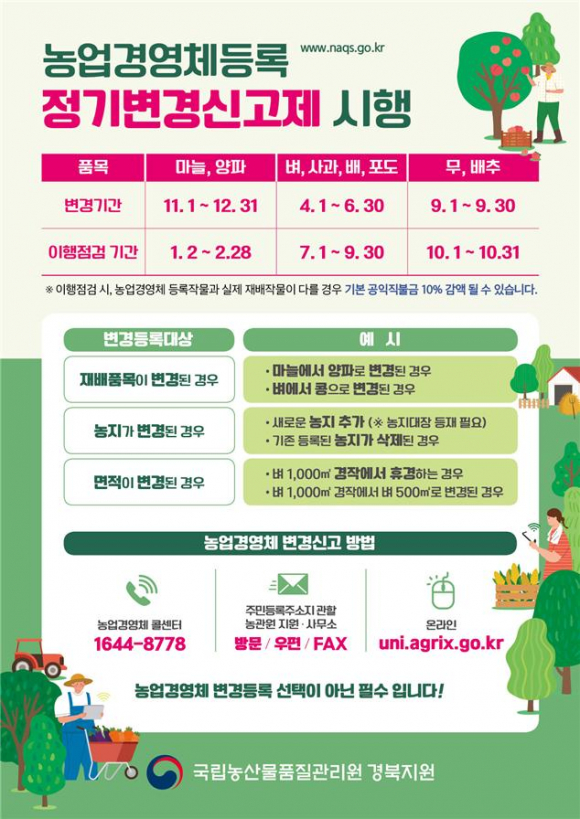 이번 점검 대상 품목은 벼를 비롯해 사과, 배, 포도, 고추, 옥수수, 콩, 인삼 등이다. 농업경영체로 등록된 농업인은 공익직불금 등 농업 관련 융자 및 보조금 혜택을 받는 대신, 재배 품목이나 농지 등이 변경될 경우 반드시 변경 신고를 해야 하는 의무가 있다.