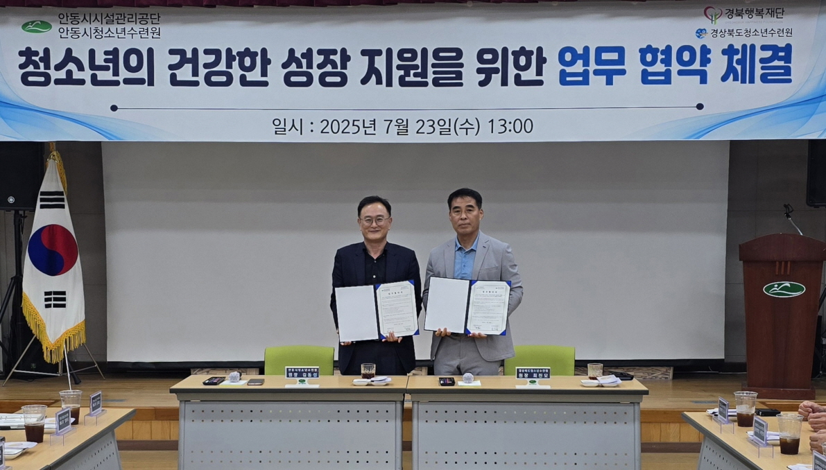 | 경북행복재단 산하 경상북도청소년수련원(원장 최진모)은 지난 7월 23일 안동시청소년수련원(원장 김동섭)과 상호 신뢰를 바탕으로 청소년활동의 저변확대를 통해 밝고 건강한 청소년의 성장을 돕고 상호 협력 및 미래지향적 관계 발전을 위한 업무협약을 체결했다고 밝혔다.