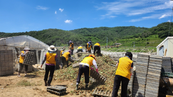 이날 봉사에 참가한 자원봉사자는 총 49명으로 현장에 도착 마을 이장의 안내에 따라 3개 조로 편성되어 침수 가옥 정리 1개 조, 농작물(딸기밭) 토사물 제거 2개 조로 나뉘어서 하우스에 심어진 딸기 모종 들어내기와 뒷밭 정리에 그야말로 구슬땀을 흘렸다.