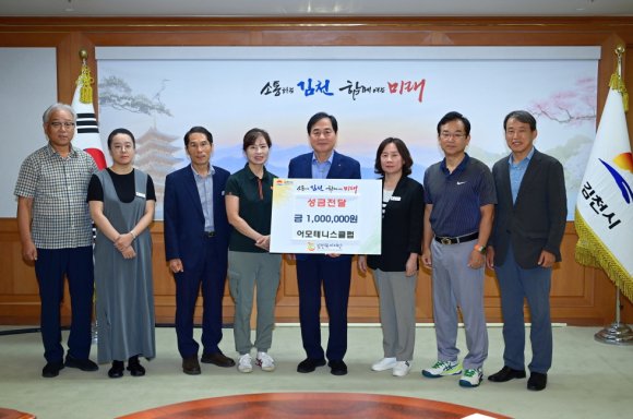 | 어모테니스클럽(회장 김재상)은 지난 8월 6일 저소득층 및 복지 사각지대에 놓인 이웃들을 돕기 위해 성금 100만 원을 김천복지재단에 기탁했다.