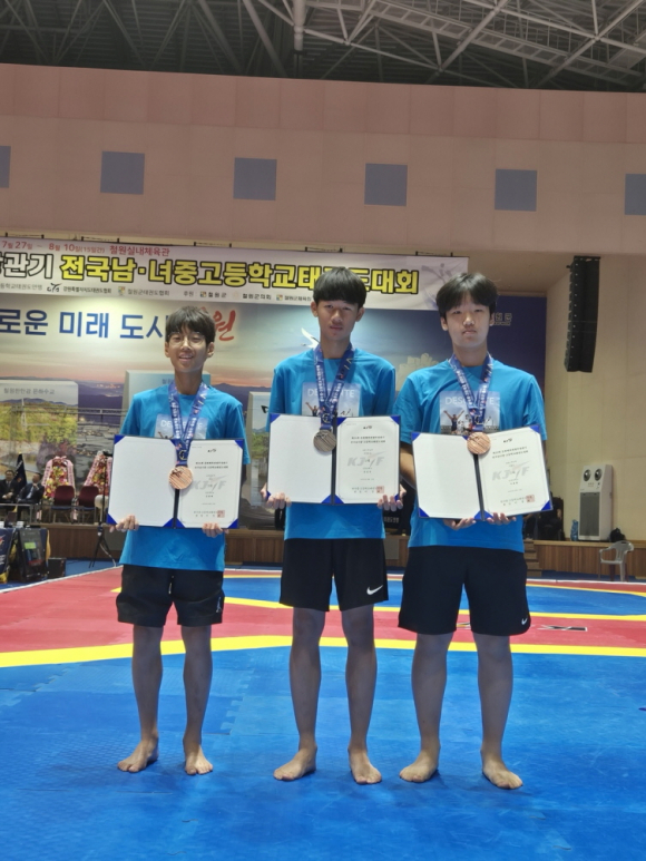 | 김천중학교(교장 장영규)는 지난 8월 2일부터 5일까지, 강원도 철원군에서 개최된 제36회 문화체육관광부장관기 전국태권도대회 겨루기 부문에 출전하여 남자중학부 라이트급 2위(1학년 강O규)미들급 3위(1학년 서O현), 2학년 핀급 3위(2학년 김O현)를 차지하는 쾌거를 이루었다.