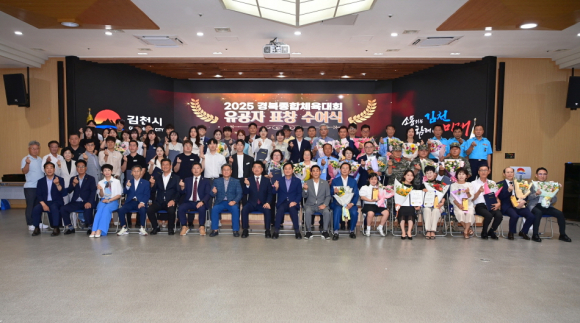 | 김천시(시장 배낙호)는 지난 8월 7일 시청 3층 강당에서 『2025 경북종합체육대회 유공자 표창 수여식』을 개최하고, 양대 체전의 성공적인 개최를 위해 헌신한 유공자들에게 감사의 뜻을 담아 표창장과 감사패를 수여했다.