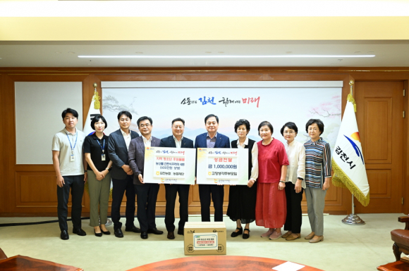 | 김천복지재단(이사장 배낙호)은 지난 8월 11일, 김천농협(조합장 윤재천)과 고향생각주부모임(회장 현숙희)으로부터 간편식 꾸러미 50상자(600만 원 상당)와 성금 100만 원을 전달받았다고 밝혔다.