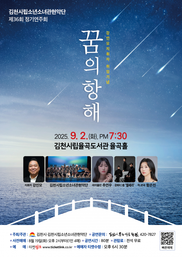 | 김천시(시장 배낙호)는 9월 2일 오후 7시 30분에 율곡도서관 율곡홀에서 시립소년소녀관현악단 제36회 정기연주회를 개최한다.