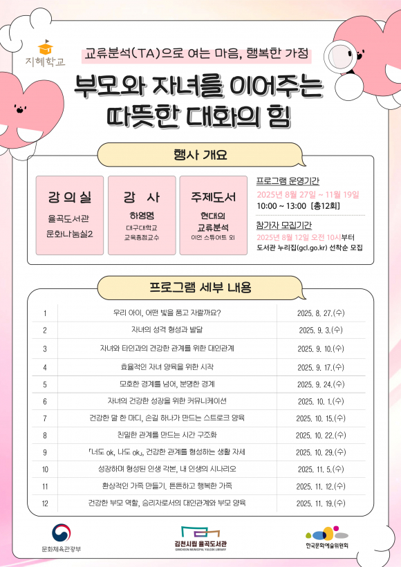 ‘2025 지혜학교’는 「부모와 자녀를 이어주는 따뜻한 대화의 힘」을 주제로, 하영명 대구대학교 교육중점교수를 초청해 8월 27일부터 11월 19일까지 총 12회에 걸쳐 운영된다. 본 프로그램에서는 교류분석(TA) 이론을 기반으로 자기 성찰과 실천 중심의 활동을 통해 효과적인 소통법을 배울 수 있다. 또한, 건강하고 행복한 가족을 만들어가는 실제적인 방법을 모색하는 시간을 제공할 예정이다.