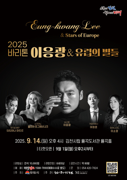 |  | | | ⓒ 김천내일신문 | | 김천시문화예술회관(관장 김해문)에서는 9월 14일 오후 4시 율곡도서관 율곡홀에서 기획공연 ‘2025 바리톤 이응광 & 유럽의 별들’을 개최한다. 이번 공연은 김천 출신의 세계적인 바리톤 이응광과 국내·외 정상급 음악가들이 펼치는 오페라 아리아와, 뮤지컬 넘버들의 갈라 콘서트이다.