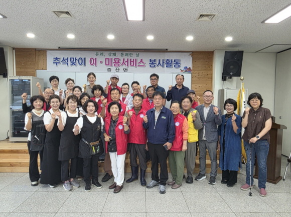 이날 행사는 미용을 사랑하는 봉사단(단장 김강숙 외 9명)의 재능기부로 마련됐으며, 이·미용실이 없는 증산면의 어르신들에게 용모 단장, 위생 관리 등 필요한 복지서비스를 제공했다. 또한, 증산면 이장협의회(회장 김창국)에서는 거동이 불편한 어르신들을 위해 차량 이동 서비스를 제공했다.