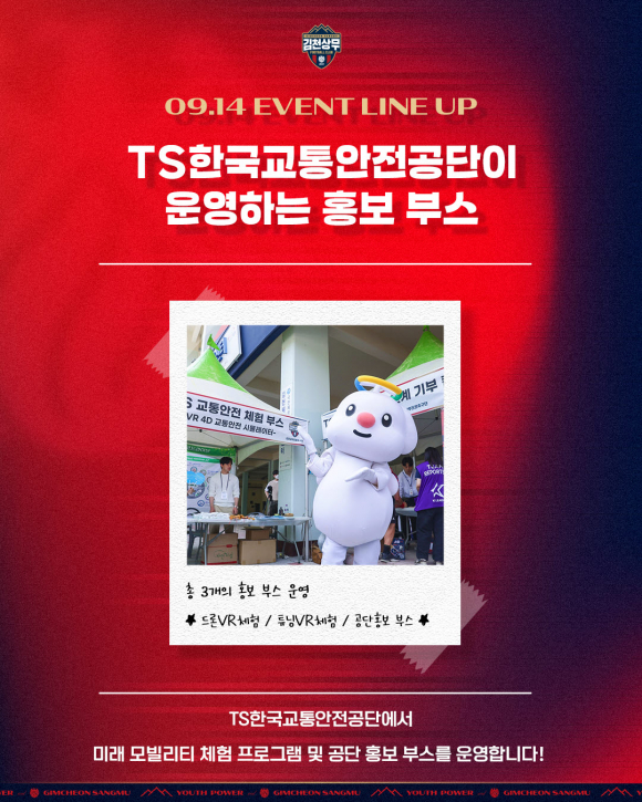 | □ TS한국교통안전공단과 함께하는 풍성한 브랜드 데이 홈경기 이벤트! 김천상무는 TS한국교통안전공단 브랜드 데이를 맞아 다양하고 의미 있는 홈경기 이벤트를 준비한다. 먼저 장외구역에서 TS한국교통안전공단의 드론과 튜닝 VR 등 미래 모빌리티 체험 프로그램과 홍보 부스를 운영한다.
