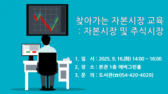 강연은 9월 16일(월) 14시부터 16시까지 김천대학교 본관 1층 에버그린홀에서 진행된다. 강연자로는 김천대학교 KRX(한국거래소) 김주용 교수가 초청되며, 「찾아가는 자본시장 교육: 자본시장 및 주식시장」이라는 주제로 자본시장과 주식시장에 대한 이해, 금융·주식 투자 전반을 다룰 예정이다.