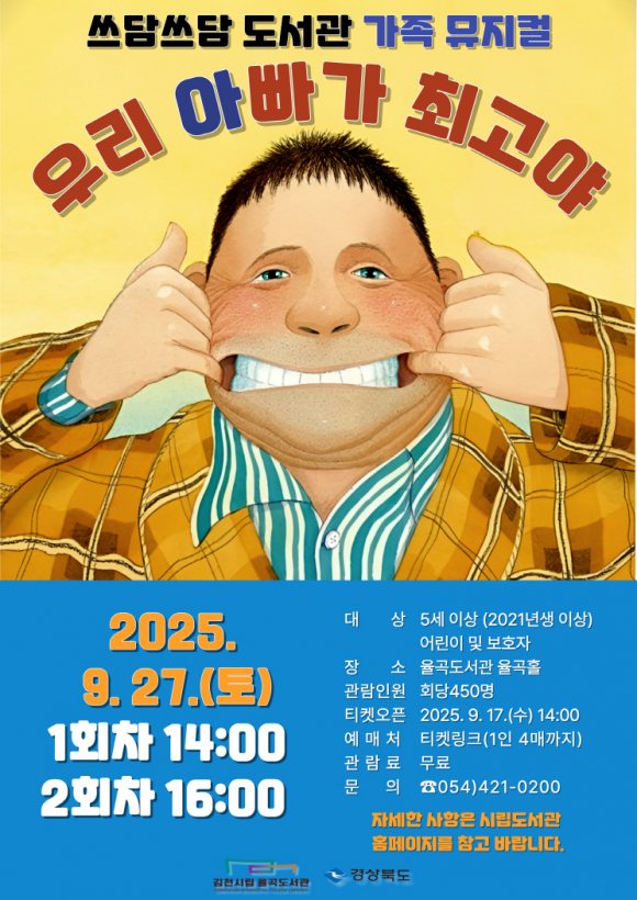 | 김천시립 율곡도서관(관장 이신기)은 오는 9월 27일 오후 2시와 4시, 두 차례에 걸쳐 율곡도서관 율곡홀에서 가족 뮤지컬 「우리 아빠가 최고야」를 공연한다고 밝혔다.