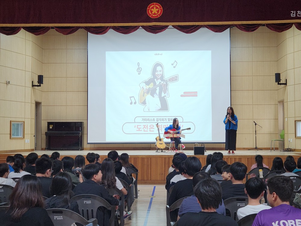 이날 전교생은 꿈마루관에 모여 아름다운 기타 선율에 귀 기울였으며, 반주에 맞춰 함께 노래를 부르며 공감과 감동을 나누었다. 또한 이순도 강사의“도전은 희망이다”라는 주제 강의를 통해 장애에 대한 올바른 이해와 함께, 서로를 배려하고 존중하는 마음가짐을 배웠다.