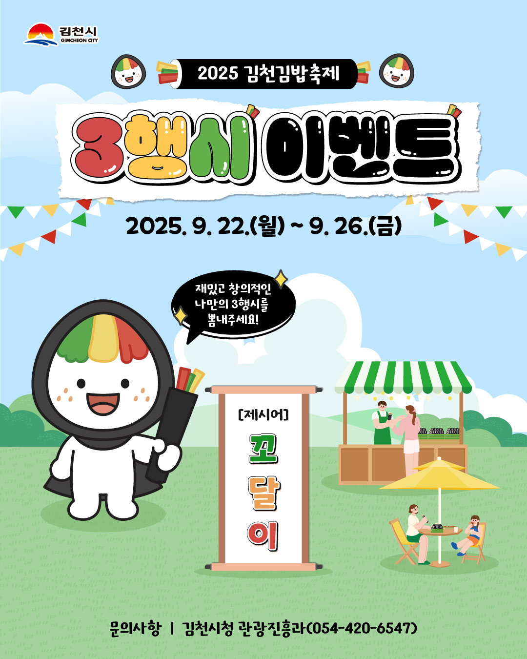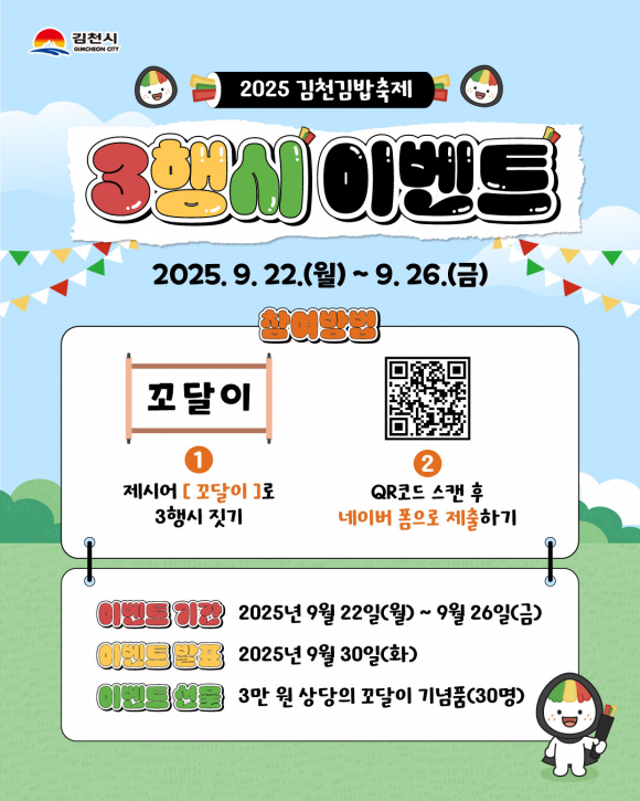 | 김천시(시장 배낙호)는 오는 10월 25일부터 26까지 이틀간 열리는 『2025 김천김밥축제』의 분위기를 조성하고 홍보하기 위해 ‘김밥축제 캐릭터 꼬달이 삼행시 짓기 이벤트’를 개최한다.