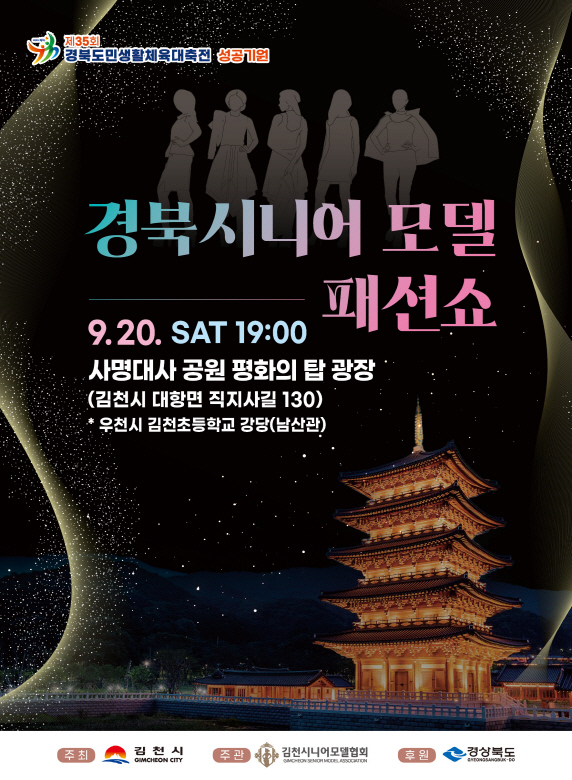 | 김천시는 오는 9월 20일 저녁 7시, 직지사 사명대사공원 평화의 탑 일원에서 「경상북도 시니어모델 패션쇼」를 개최한다고 밝혔다.