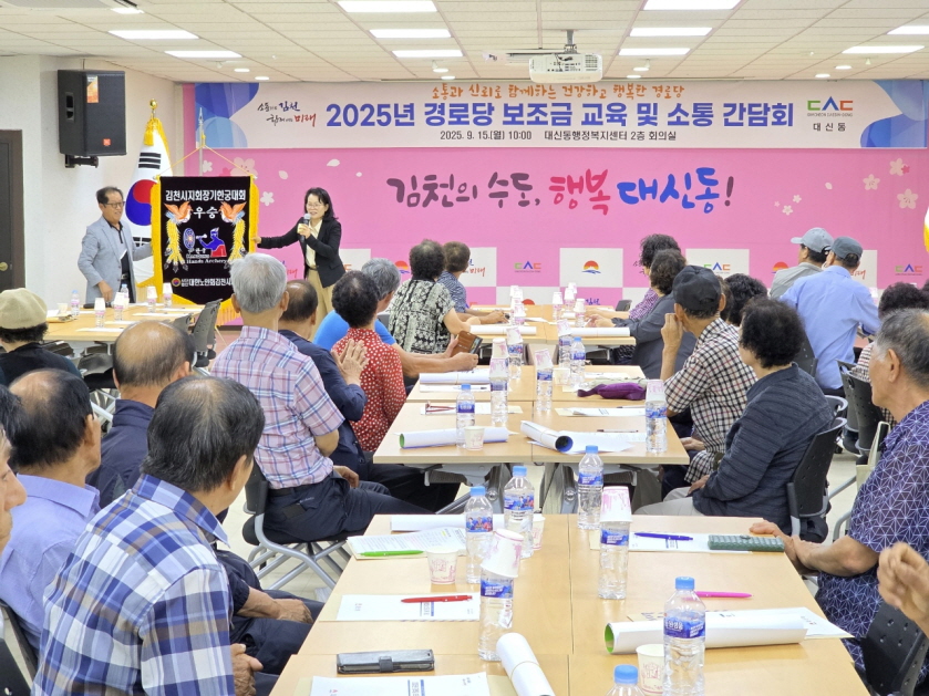 | 김천시 대신동 행정복지센터(동장 이해정)는 9월 15일 오전 10시 행정복지센터에서 관내 경로당 39개소 회장 및 총무를 대상으로 보조금 교육 및 소통 간담회를 개최했다.