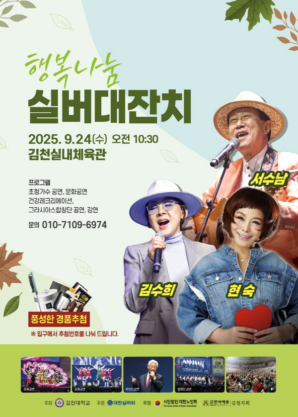 | 김천대학교(총장 윤옥현)는 오는 2025년 9월 24일 오전 10시 30분, 김천실내체육관에서 지역 어르신 약 5,000여 명을 대상으로 ‘2025 행복나눔 실버 대잔치’를 개최한다고 밝혔다.