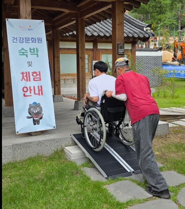건강문화원은 전통 한옥양식의 숙박 및 체험시설을 갖춘 공간으로, 고유의 전통미를 유지하면서도 일부 시설에서는 턱이나 계단으로 인해 이동이 불편한 경우가 있었다. 이에 공단은 접근성 개선의 필요성을 인식하고, 장애인과 이동 약자를 포함한 모든 시민이 편리하게 이용할 수 있도록 접이식 경사로를 마련하였다.