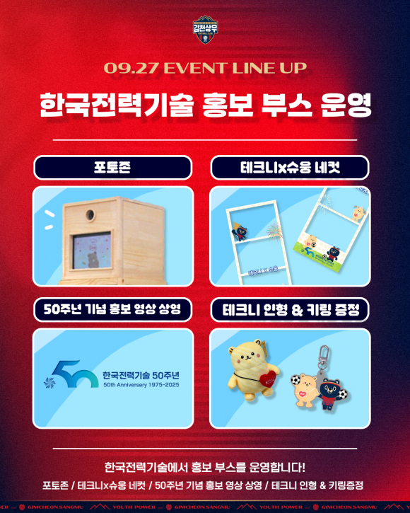 | □ ‘한국전력기술 브랜드데이’ 창립 50주년에 걸맞은 풍성한 이벤트! 김천상무는 오는 포항전 홈경기에서 한국전력기술 브랜드데이를 맞아 신선하고 다양한 이벤트를 준비한다. 김천시에 본사를 둔 한국전력기술은 국내 대부분의 원자력 및 화력발전소를 설계한 우리나라 대표 엔지니어링 공기업으로서, 해상풍력을 비롯한 신재생에너지와 AI기반 디지털 엔지니어링을 수행하는 친환경 에너지 기술 회사이다. 올해로 창립 50주년을 맞이하여 축구팬을 포함한 국민에게 한 걸음 더 다가가기 위해 김천상무와 함께 브랜드데이를 진행한다.