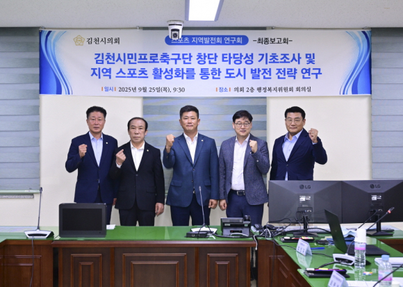 | 김천시의회 스포츠지역발전연구회(배형태·진기상·정재정·박복순 의원)는 9월 25일 행정복지위원회 회의실에서 『지역 스포츠 활성화를 통한 도시 발전 전략 연구』의 최종보고회를 개최했다.