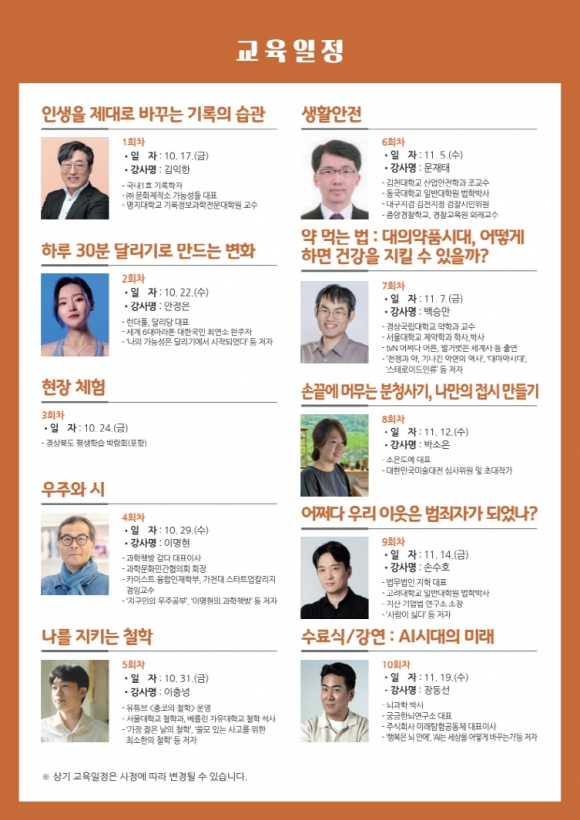 | 김천시는 지역 내 우수한 여성 리더를 발굴·양성하고 여성의 사회참여 기회를 확대하기 위해 「제41기 김천시여성대학」을 운영한다고 밝혔다. 교육에는 김천시 거주 여성 누구나 참여할 수 있으며, 9월 29일부터 10월 15일까지 신청이 가능하다. 교육 과정은 건강, 과학, 철학, 실생활에 필요한 정보 등 수강생들의 지적 호기심을 충족시키고 실질적인 생활에 도움을 줄 수 있는 다양한 주제의 강연들로 구성되며, 10월 17일 시작해 11월 19일까지 매주 수, 금요일 10시부터 총 10회에 걸쳐 진행된다.