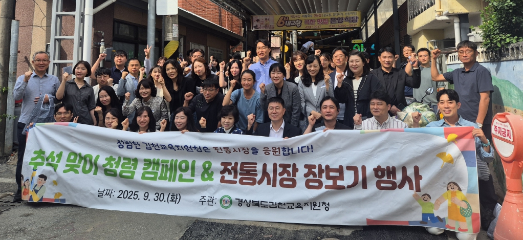 | 경상북도김천교육지원청(교육장 모태화)은 2025년 추석 명절을 앞두고 9월 30일 황금시장에서 ‘추석맞이 전통시장 장보기 행사’를 실시하였다. 이번 행사는 물가 안정과 지역경제 활성화를 도모하는 동시에, 청렴한 공직문화를 확산하고 상생의 가치를 실천하기 위해 마련됐다.