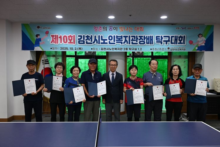 |  | | | ⓒ 김천내일신문 | | 김천시노인복지관은 2025년 10월 2일 복지관 이용 어르신의 건강한 여가생활과 친목도모를 위한 제10회 김천시노인복지관장배 탁구대회를 성황리에 개최했다.