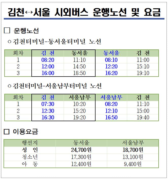 이번에 개통된 노선은 김천↔동서울터미널, 김천↔서울남부터미널 등 2개 노선으로, 상세한 내용은 아래 표와 같다.
