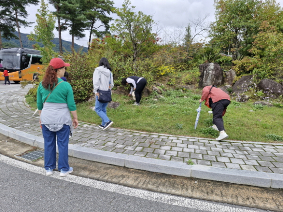 빗속을 뚫고 아시아 최대규모의 국립백두대간수목원에 도착하니 때마침 날씨가 맑아 있어 참가자들의 기분을 업 시켜 주었으며 수목원 인근 도로변 및 주차장 주변에 흩어진 휴지 및 쓰레기를 봉지에 주워 담기도 하여 자원봉사자 모습 그대로를 보여주기도 하였다.