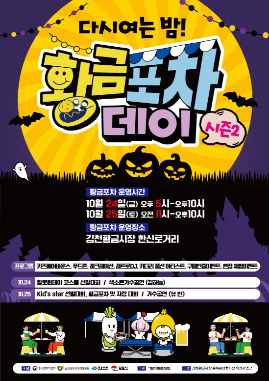 | 김천시(시장 배낙호)에서는 황금시장상인회(회장 박선광)가 10월 24~25일 ‘다시 여는 밤, 황금포차 데이’를, 부곡맛고을상인회(회장 김동건)가 25~26일 ‘부곡맛고을 축제, 스위치 온’을 각각 개최한다고 밝혔다.