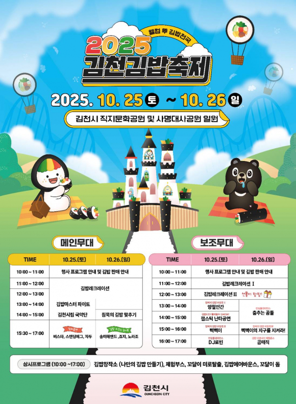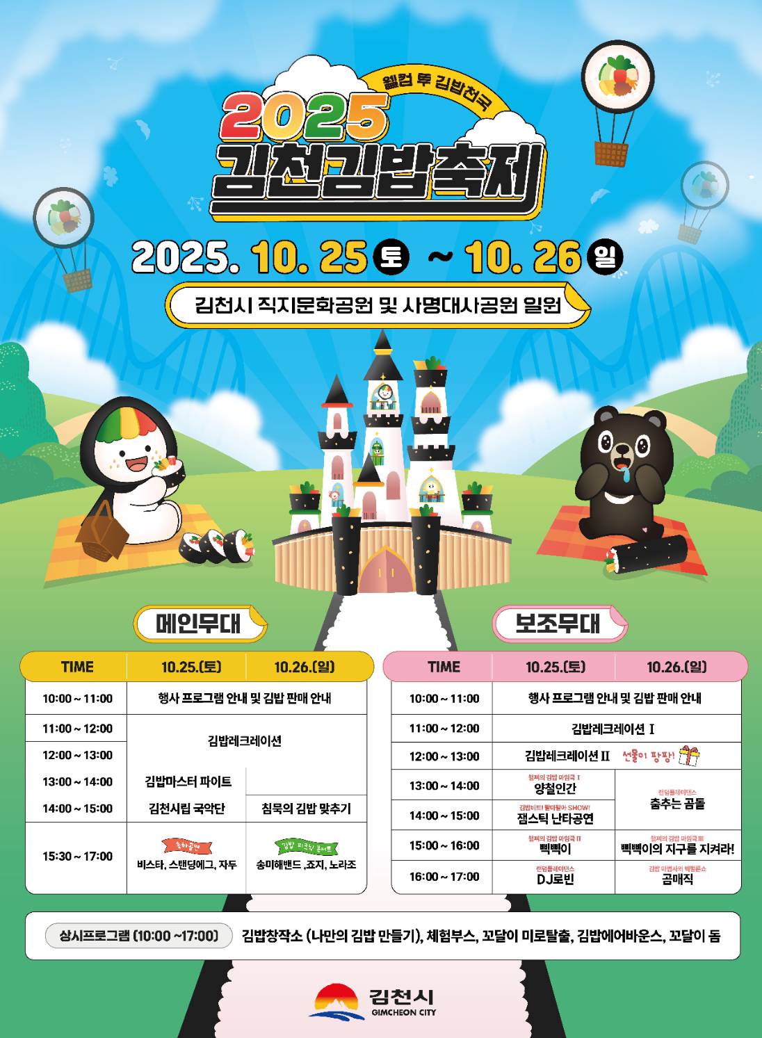 올해로 2회째를 맞은 『2025 김천김밥축제』는 10월 25일부터 26일까지 2일간 직지문화공원 및 사명대사공원 일원에서 개최된다.