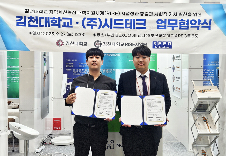 | 김천대학교(총장 윤옥현) 지역혁신중심 대학지원체계(RISE)사업단 토탈케어센터는 부산 BEXCO 「KIMES 부산 2025」 현장에서 헬스케어 기술기업 ㈜SEED TECH(대표 전호준)과 업무협약(MOU)을 체결하고, 지역 기반 헬스케어 혁신과 스마트 재활교육 인프라 구축을 위한 상호 협력 체계를 확립하였음을 10월 23일 밝혔다.