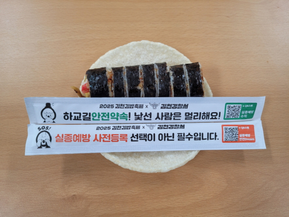 한편, 10.25.~10.26. 이틀간 진행된 김천김밥축제 경찰홍보부스에서는 김천시청과 협업하여 제작한 유괴·실종 예방 3원칙과 실종예방안전드림 QR코드가 인쇄된 나무젓가락을 나누어 주어 시민들의 큰 호응을 얻었다.