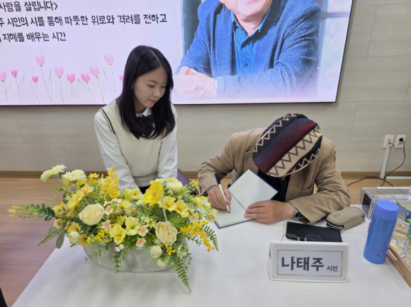 강연 이후 이어진 질의응답 시간에는 “사랑에 관한 시를 자주 쓰시는 이유는 무엇인가요?”, “시를 잘 쓰고 싶지만 자신이 없을 때 어떻게 해야 할까요?”, “독자들이 시를 어떤 마음으로 읽어주기를 바라시나요?” 등 다양한 질문이 쏟아져 학생들의 높은 관심을 확인할 수 있었다. 시인은 자신의 경험을 바탕으로 성심껏 답하며 학생들과 활발하게 소통하였다.