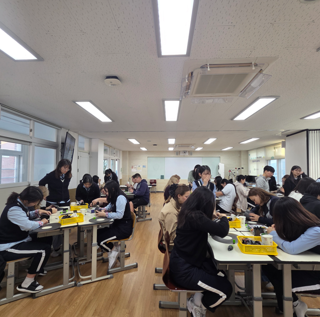 K-POP에서 전통으로 ― ‘갓·주영 만들기’와 ‘전통 놀이 체험 부스’ 올해 프로그램은 ‘케이팝 데몬 헌터스’의 인기를 바탕으로 한국 전통의 멋을 알리는 활동이 눈길을 끌었다. 헝가리 학생들은 ‘갓과 주영(갓끈)’을 직접 만들어보며 조선 시대 복식문화의 정교함을 배우고, 완성된 갓을 착용한 채 교내 전통 건축물 앞에서 사진을 찍으며 한국적 미를 체험했다. 또한 한일여자고등학교(김천한일고등학교) 학생들은 ‘제기차기’, ‘공기놀이’, ‘투호놀이’, ‘딱지치기’, ‘달고나 뽑기’ 등 다양한 전통 놀이 체험 부스를 운영해 헝가리 학생들에게 놀이를 통한 한국 문화의 즐거움을 전했다. 활기찬 웃음소리로 가득한 체험장은 양국 학생들이 함께 어울려 소통하는 공간이 되었다.