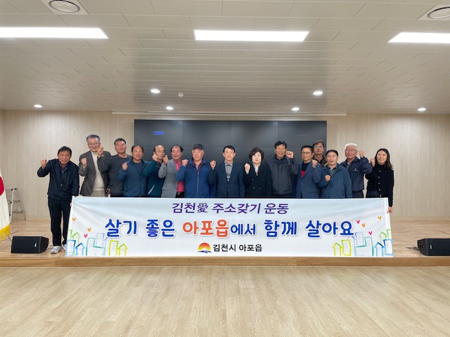 | 김천시 아포읍 단체장협의회(회장 박용국)는 지난 10월 31일 아포읍 행정 복지센터에서 ‘살기 좋은 아포에서 함께 살아요’를 주제로 김천愛 주소갖기 실천 다짐 행사를 개최했다. 이번 행사는 모두가 살고 싶은 아포읍을 만들기 위한 지역 단체들의 자발적인 참여 속에 진행됐다.