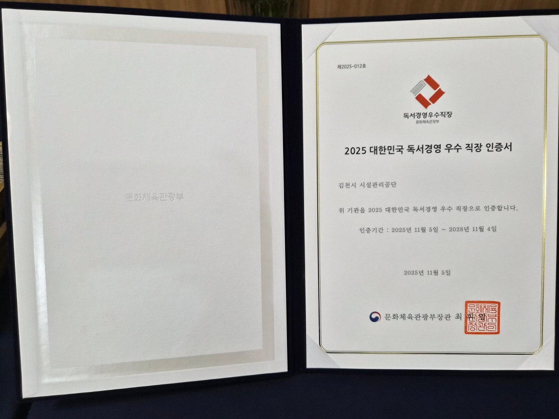 이번 인증으로 김천시시설관리공단은 정부로부터 공식 ‘독서경영 우수 직장’ 현판과 인증서를 수여받았으며, 향후 3년간 인증 유효기관 동안 독서경영 컨설팅, 우수기관 네트워킹 등 다양한 후속 혜택을 얻게 된다.