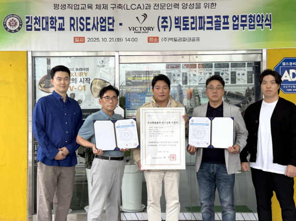 | 김천대학교(총장 윤옥현) RISE사업단은 ㈜빅토리파크골프(대표 표기한)와 평생직업교육체제 구축과 전문인력 양성, 지역 일자리 창출을 위한 공동협력 업무협약(MOU)을 체결했다고 11월 7일 밝혔다.