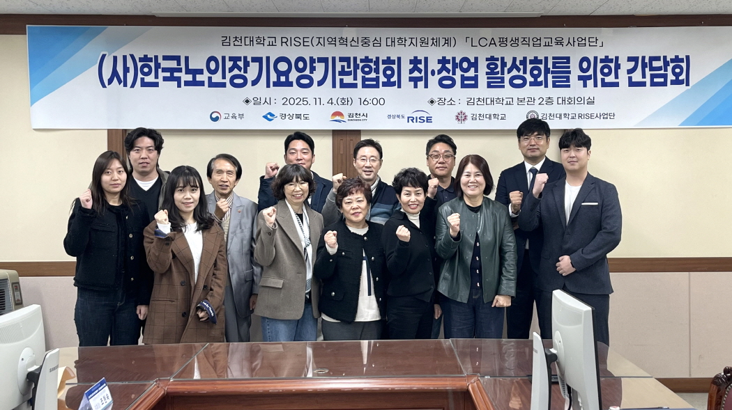 | 김천대학교(총장 윤옥현) RISE사업단은 김천대학교 본관 2층 대회의실에서 (사)한국재가장기요양기관협회(지회장 조현숙)와 함께 성인학습자 취·창업 활성화 및 요양서비스 분야 전문인력 양성을 위한 협력 간담회를 개최했다고 11월 10일 밝혔다.