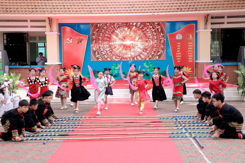 서로의 공연을 관람한 후 학생들은 문화교류 시간이 이어졌다. 개령초 학생들이 준비한 제기차기, 공기놀이 등 한국 전통 놀이 체험 부스는 큰 인기를 끌었다. 또한, 농악 악기 및 상모 체험을 통해 베트남 친구들이 한국 문화를 보다 깊이 이해하는 시간을 가졌다. 레반땀초에서는 베트남의 전통 찹쌀반죽 공예인 또헤(Tò he) 만들기와 역동적인 '사다리 춤' 체험을 준비하여 학생들에게 베트남 문화를 직접 느낄 수 있는 기회를 제공했다. 특히, 양교 학생들은 급식을 함께 나누어 먹으며 자연스럽게 소통하고 친밀감을 형성하는 시간을 가졌다.