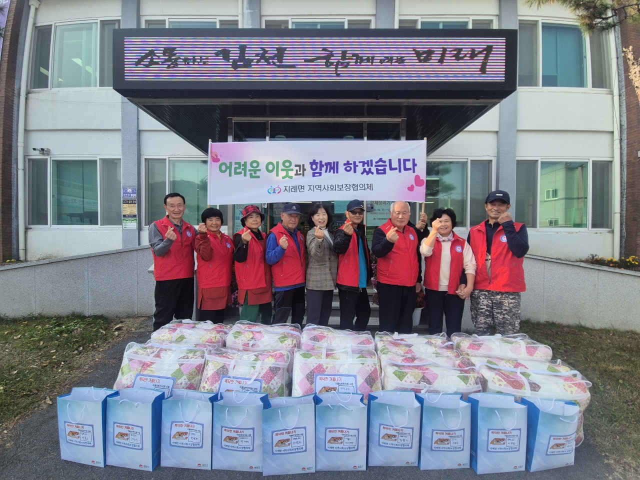 | 지례면 지역사회보장협의체(위원장 문혜숙)는 11월 13일 관내 독거노인 등 저소득 취약 가구를 대상으로 ‘폭닥한 겨울나기 이불&반찬지원사업’을 실시했다.