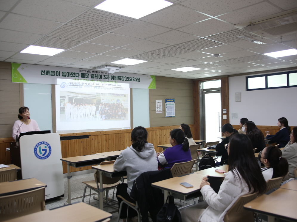 | 경북보건대학교(총장 이은직)는 11월 14일 본관 1506호에서 간호학과 재학생을 대상으로 「선배들이 돌아왔다 동문 릴레이 취업특강」 3차 프로그램을 성공적으로 개최했다고 밝혔다.