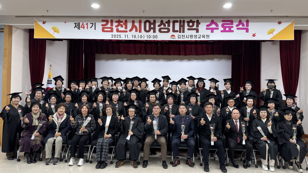 | 김천시는 지난 11월 19일 평생교육원 3층 강당에서 가을의 시작과 함께한 「제41기 김천시여성대학」수료식을 성황리에 개최했다. 이날 수료식은 수료 소감 발표, 수료증 전달, 개근상 수여, 평생교육원장 인사말과 시의회 김세호 운영위원장의 축사로 진행됐다. 또한, 수료식 이후 장동선 뇌과학자가 ‘AI시대의 미래’라는 주제로 강연을 진행해 수료생들에게 미래 사회 변화에 대한 유익한 시사점을 전했다. 이번 여성대학은 총 10회 과정으로 운영되었으며, 다양한 전문 분야의 수준 높은 강연과 현장 체험 등으로 구성돼 수강생들로부터 큰 호응을 얻었다. 특히, 건강, 자기계발, 생활안전 등 실생활에 유용한 내용으로 마련되어 수강생들의 높은 만족도를 이끌었다.